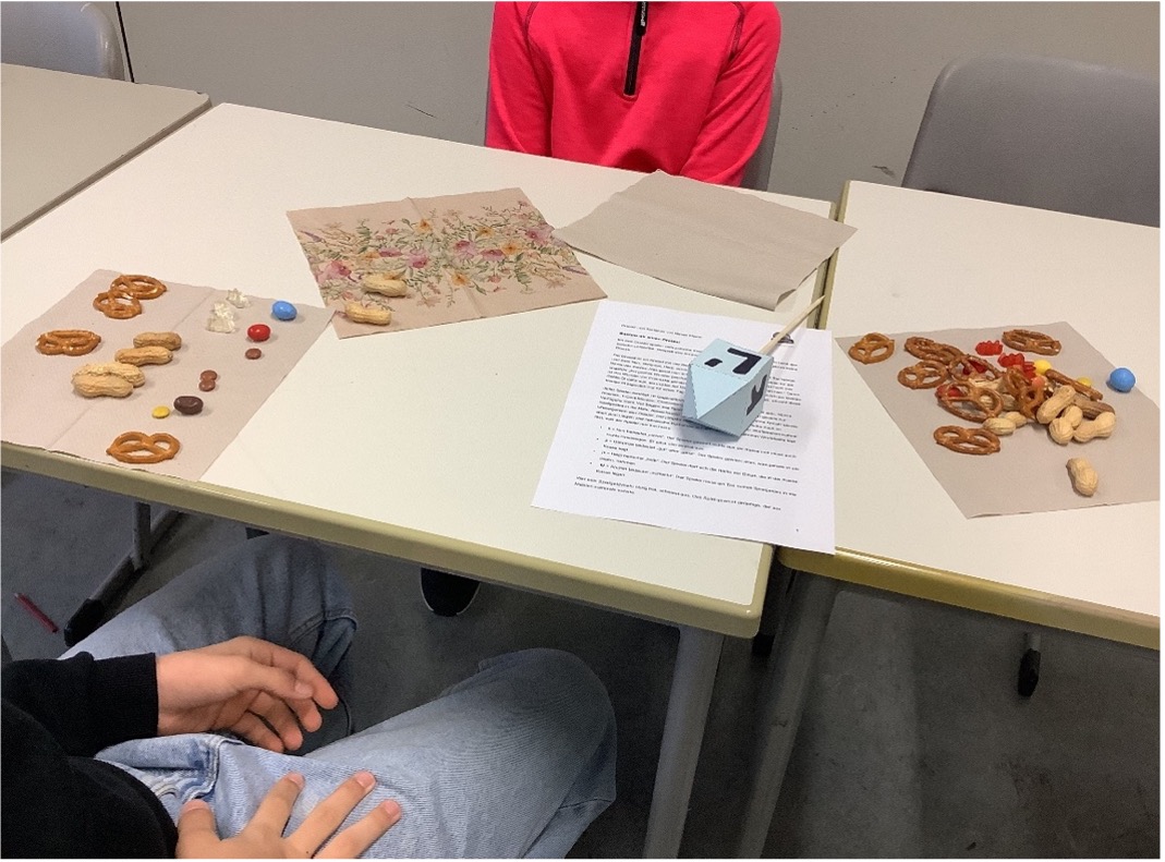 Nachdem vier SchülerInnen der Klasse 6 einen Dreidel zu Hause gebastelt hatten, konnte das Spiel im Unterricht losgehen. Es machte der Gruppe großen Spaß.