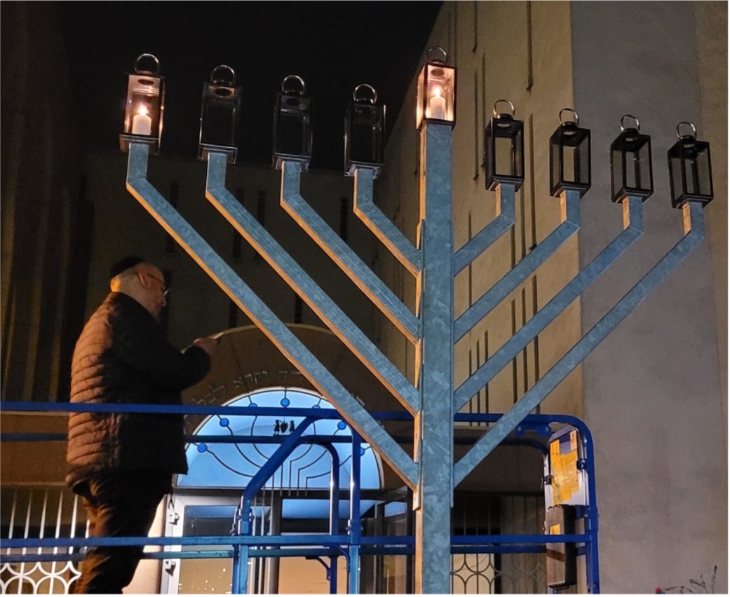 Am 14. Dezember 2025 war eine kleine Gruppe unserer Schulgemeinschaft dann an der Synagoge beim Entzünden des ersten Lichtes am großen Chanukkaleuchter.